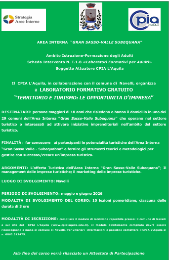 The aim of the free course, addressed to young people, is to create new opportunities for the local area. The course is organized in collaboration with the CPIA of L’Aquila, SNAI Gran Sasso Valle Subequana, and the Comprehensive Institute of Navelli.